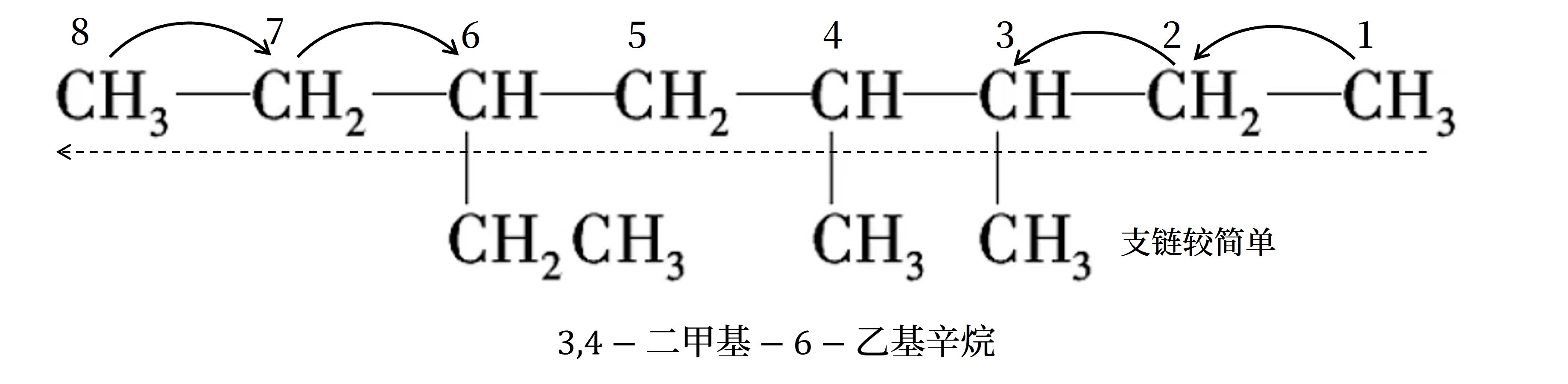- 同「近」考虑「简」:有两个不同的支链,且分别处于距主链两端同近的位置则从 支链较简单的一端 开始编号
