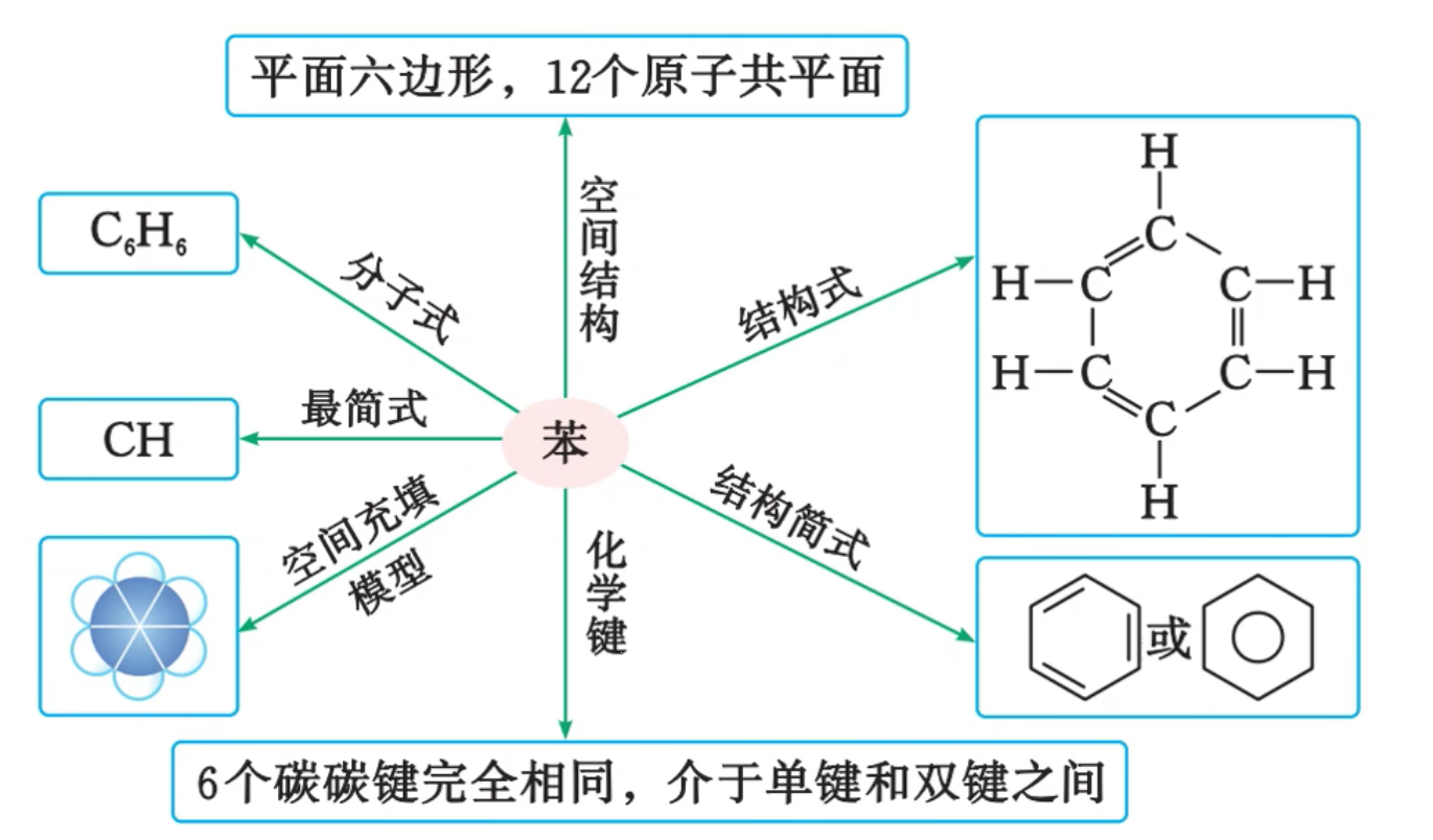 苯分子中 6 个碳原子连接成平面正六边形,每个碳原子分别结合 1 个氢原子,分子中 6 个碳原子和 6 个氢原子完全等价。人们称苯的这种特殊结构为苯环结构