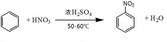 2. 在浓硫酸作用下,苯在 5060°C (水浴加热)与浓硝酸发生硝化反应,生成硝基苯