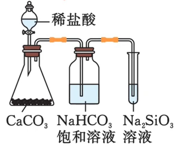 • NaHCOA3 饱和溶液用于除去 COA2 中的 HCl,防止其进入试管中也反应生成硅酸而干扰实验